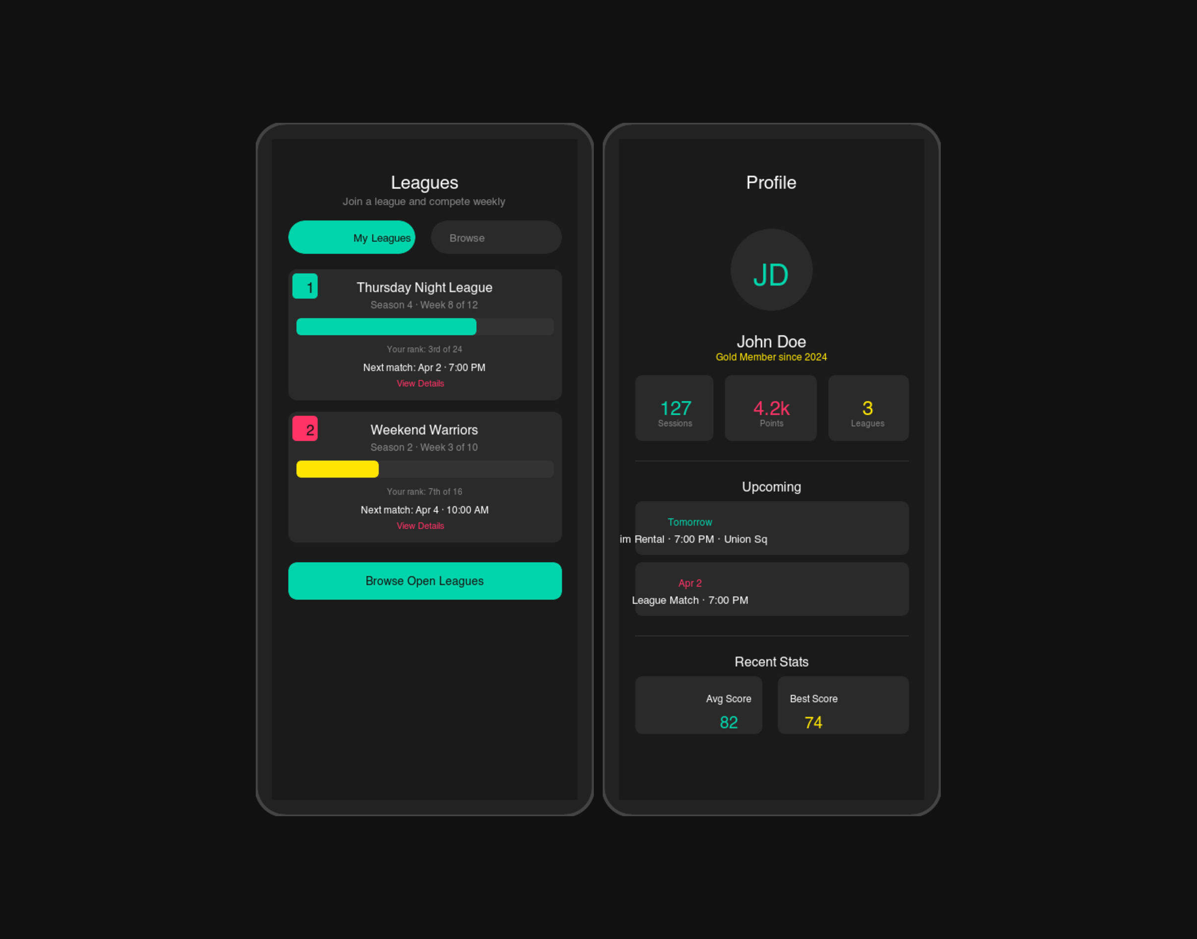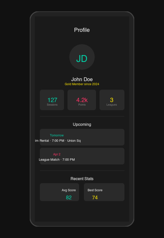 Treeline built Five Iron's cross-platform mobile app with React Native, featuring QR check-in, push notifications, and event browsing. The Voucherify-powered rewards system lets members earn and redeem points across bookings and F&B. Lucra Sports SDK integration enables peer-to-peer wagering and paid tournaments with Trackman-verified outcomes.